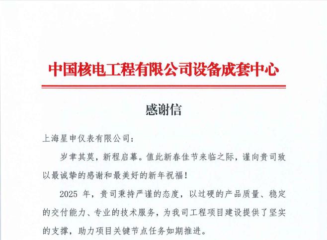 近日,上海星申儀表有限公司接連收到中國核電工程有限公司設(shè)備成套中心與國核自儀系統(tǒng)工程有限公司發(fā)來的感謝信,信中高度贊揚(yáng)了公司在過去一年為核電項(xiàng)目所做出的突出貢獻(xiàn),彰顯了公司在儀表生產(chǎn)領(lǐng)域的強(qiáng)大實(shí)力與專業(yè)水準(zhǔn)。